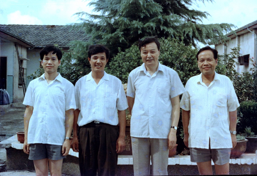 The former vice president of the Party Committee of the Zhejiang Provincial Party Committee and the then secretary of the CPC Haining Municipal Party Committee, Fang Genrong (second from right), took photos with the director Shen Guofan after the guidance of the Xucun warp knitting factory.