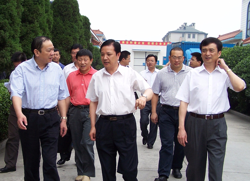 中宣部常務副部長、中央文明辦主任(時任中共嘉興市委書記)黃坤明(左一)在浙江宏達經編有限公司指導工作