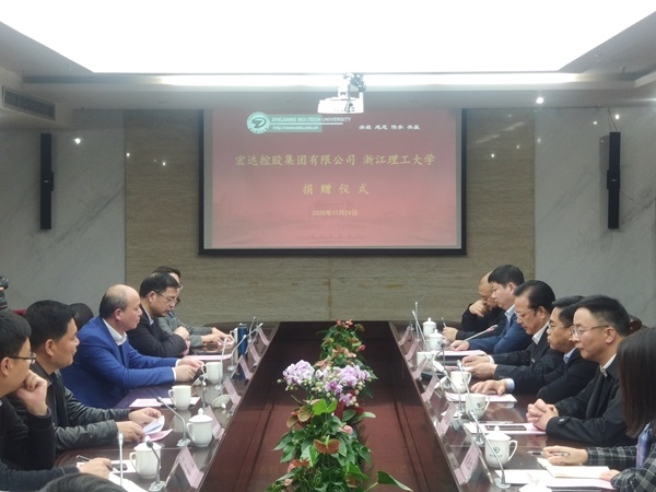 11月24日下午4點,捐贈儀式在浙江理工大學(xué)行政樓308會議室舉行。浙江省教育廳黨委副書記干武東、海寧市人民政府副市長楊文華、海寧市許村鎮(zhèn)人民政府黨委書記杜瑩池、宏達控股集團、宏達高科董事長沈國甫、宏達控股集團總經(jīng)理、高科副董事長沈珺等嘉賓,浙江理工大學(xué)校長陳文興、教育發(fā)展基金會理事長陳建勇以及相關(guān)職能部門負(fù)責(zé)人出席捐贈儀式。浙江理工大學(xué)校黨委副書記周文龍主持儀式。