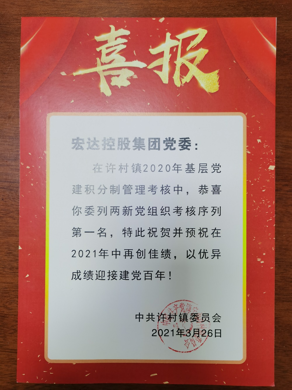 宏達(dá)控股集團(tuán)黨委在許村鎮(zhèn)2020年度基層黨建積分制管理考核中委列兩新組織考核第一名。