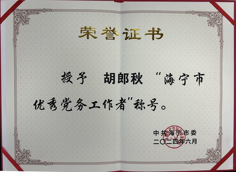 6月27日上午,海寧市召開慶祝中國共產黨成立103周年暨“兩優一先”表彰大會,胡郎秋同志在會上獲評“海寧市優秀黨務工作者”。
