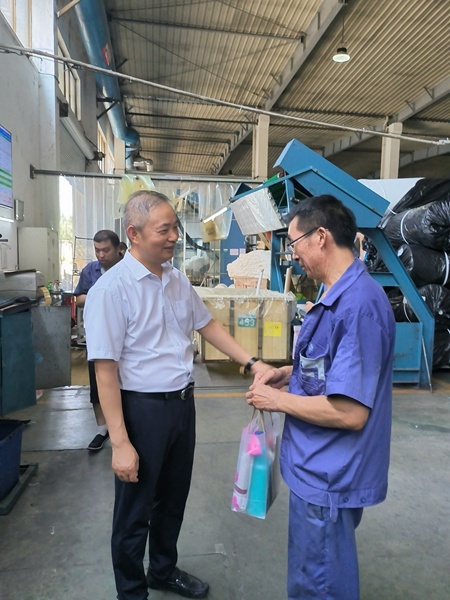 在“宏達高科”生產(chǎn)車間,工人們正揮汗如雨,緊張有序地進行著定型、染色等工序。許建舟總經(jīng)理一行帶著防暑降溫物資,親手將裝著沐浴露、冰紅茶、毛巾等物品的“防暑降溫大禮包”遞到員工手中,并向他們送上了誠摯問候與深切敬意。